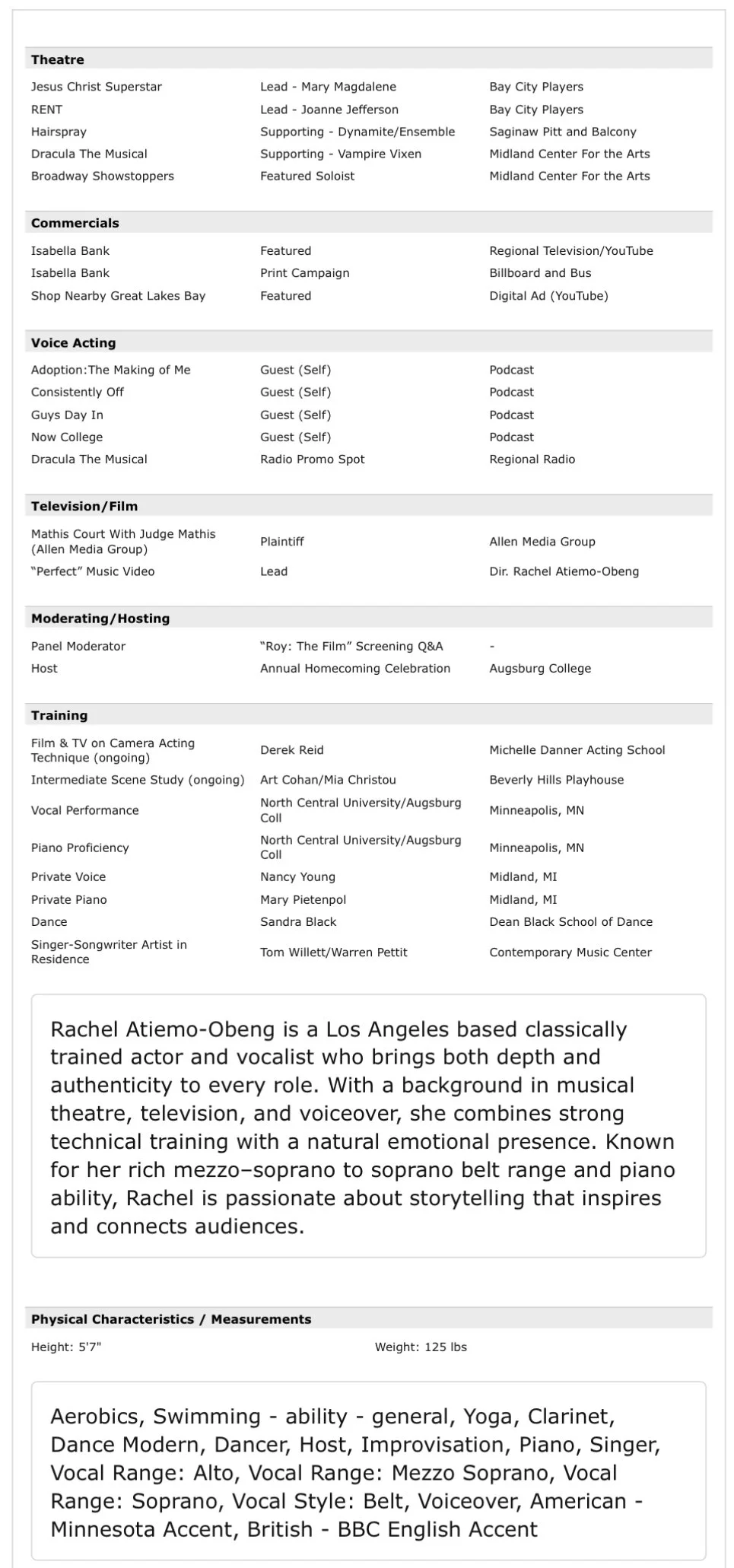 Rachelao.casting@gmail.comDownload ResumeView Reel Actors Access . Casting Networks . IMDb Resume Rachel Atiemo-Obeng - Non Union
